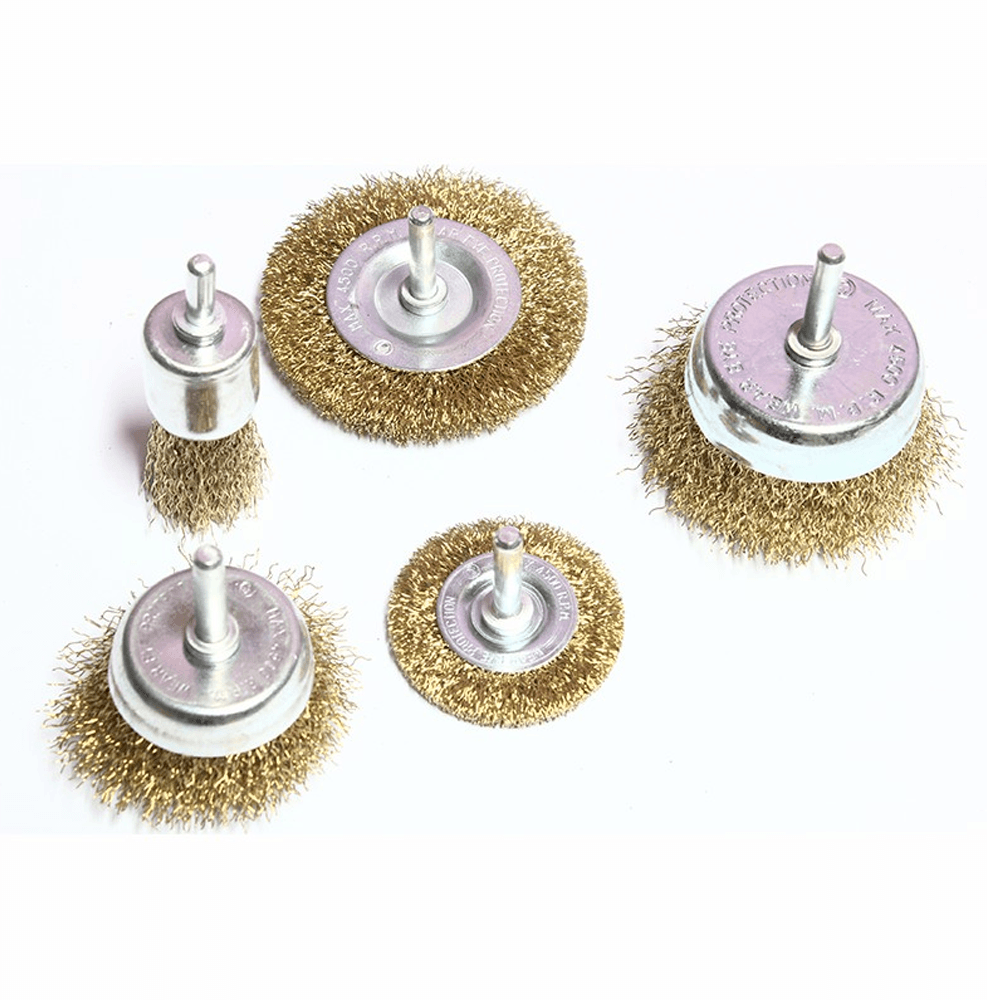 Juego de escobillas para taladro 5 piezas, fabricado en acero e hilos dorados, agarre central para taladro, 2 piezas tipo rueda y 3 tipo copa.