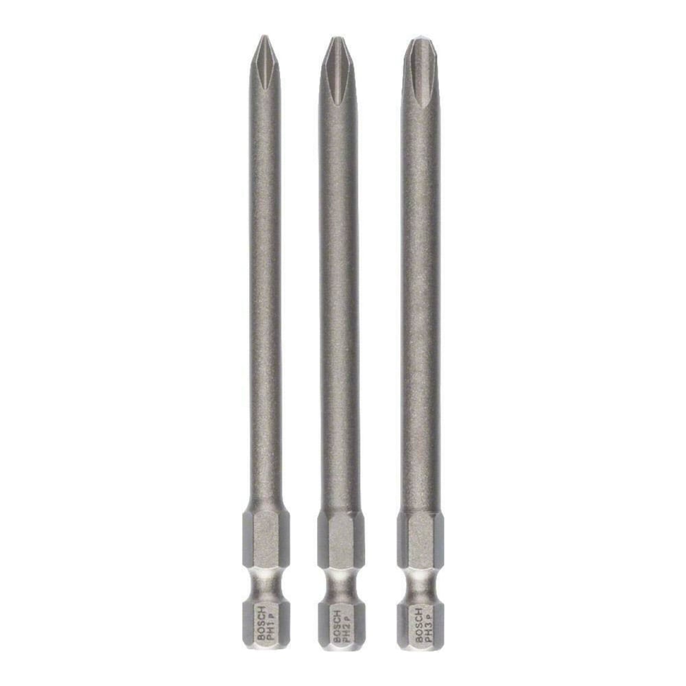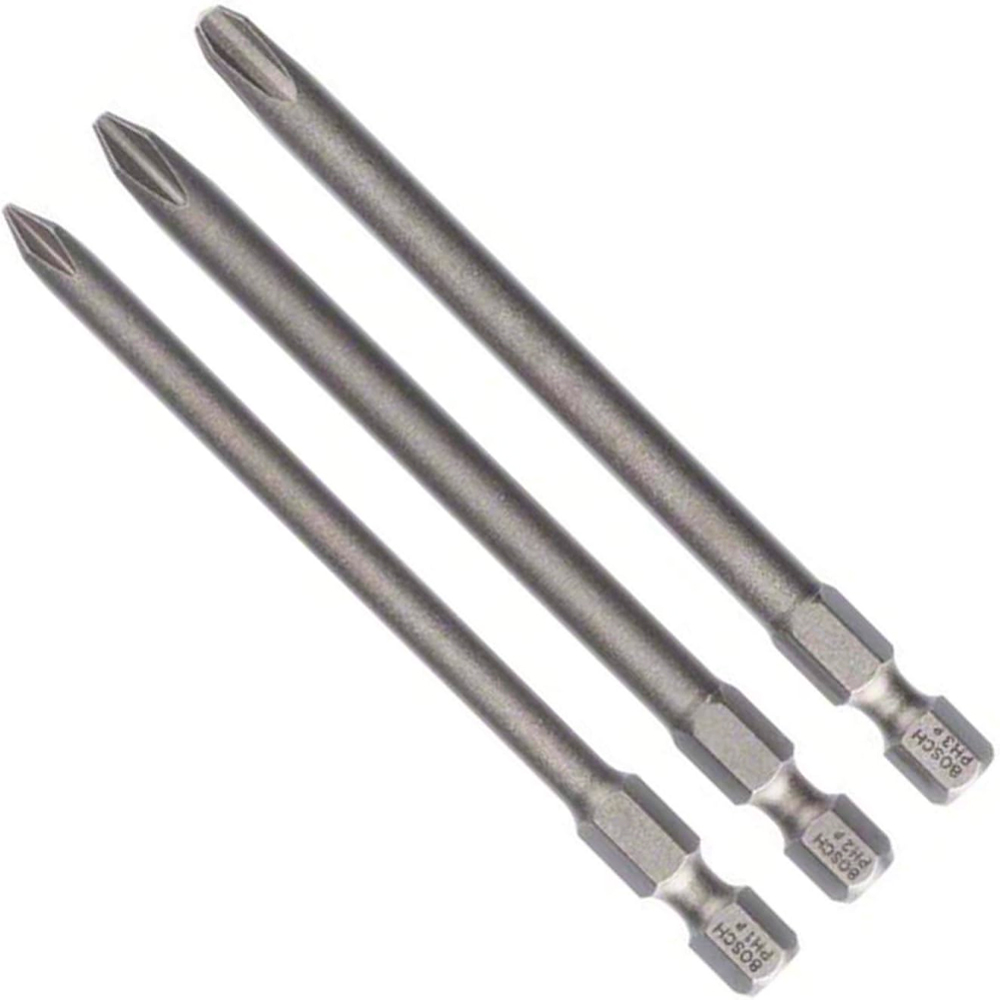 El juego consta de 3 puntas largas de destornillador de 89mm, para tornillos de cabeza Philips, con sección hexagonal de » en el otro extremo de la punta.