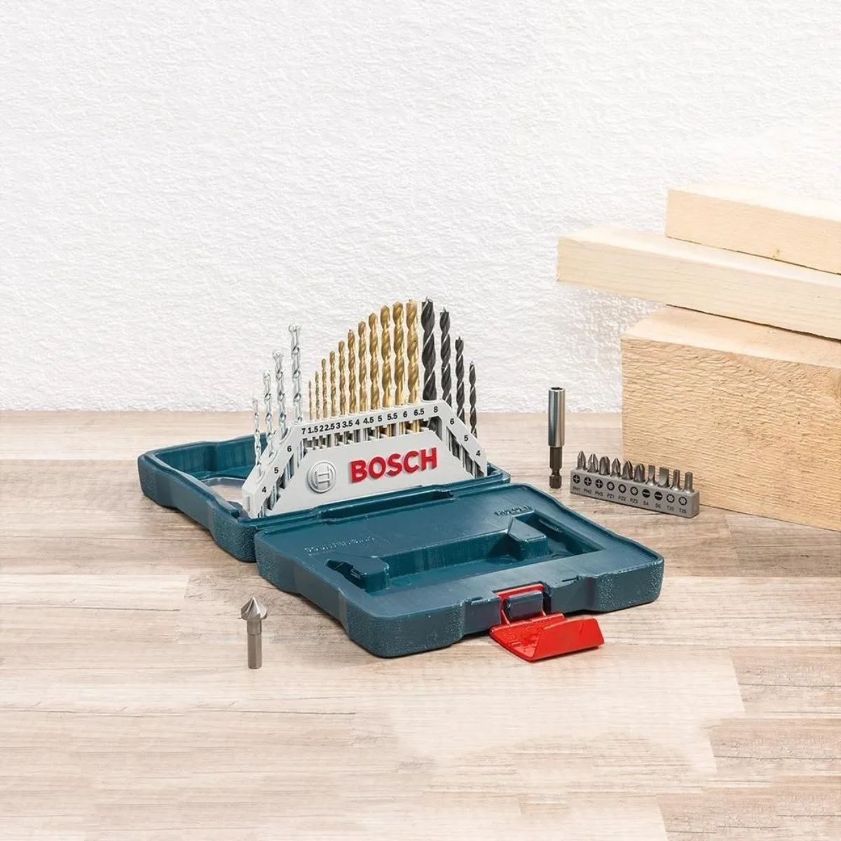 – Incluye brocas helicoidales, brocas para mampostería y puntas variadas