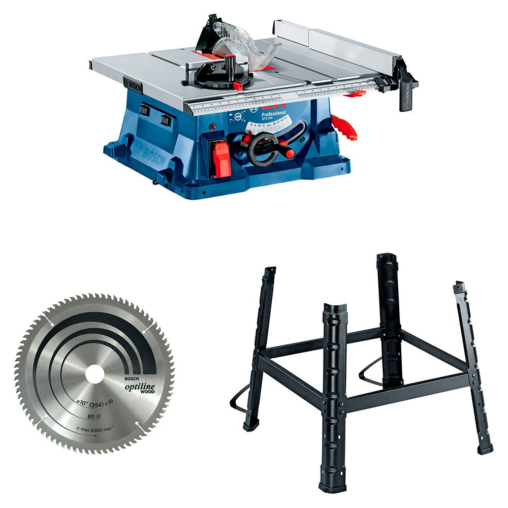 La Sierra de Banco Bosch GTS 254 viene lista para usar acompañada de la mesa y 1 disco de 80 dientes,1 guía para corte en ángulo,1 llave de apriete/cambio de accesorio,1 regla paralela.