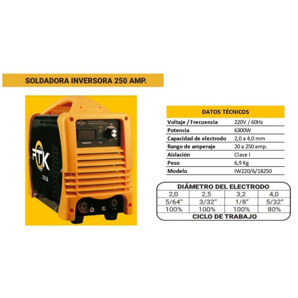 La soldadora inversora PTK de 250 amperios es una herramienta potente, compacta y liviana, ideal para trabajos de soldadura exigentes tanto en taller como en campo. Su tecnología inverter permite un bajo consumo eléctrico y un rendimiento eficiente, facilitando un arco estable y acabados limpios. Gracias a su display digital y sistema de protección térmica, ofrece un manejo seguro, preciso y confiable incluso en jornadas prolongadas.