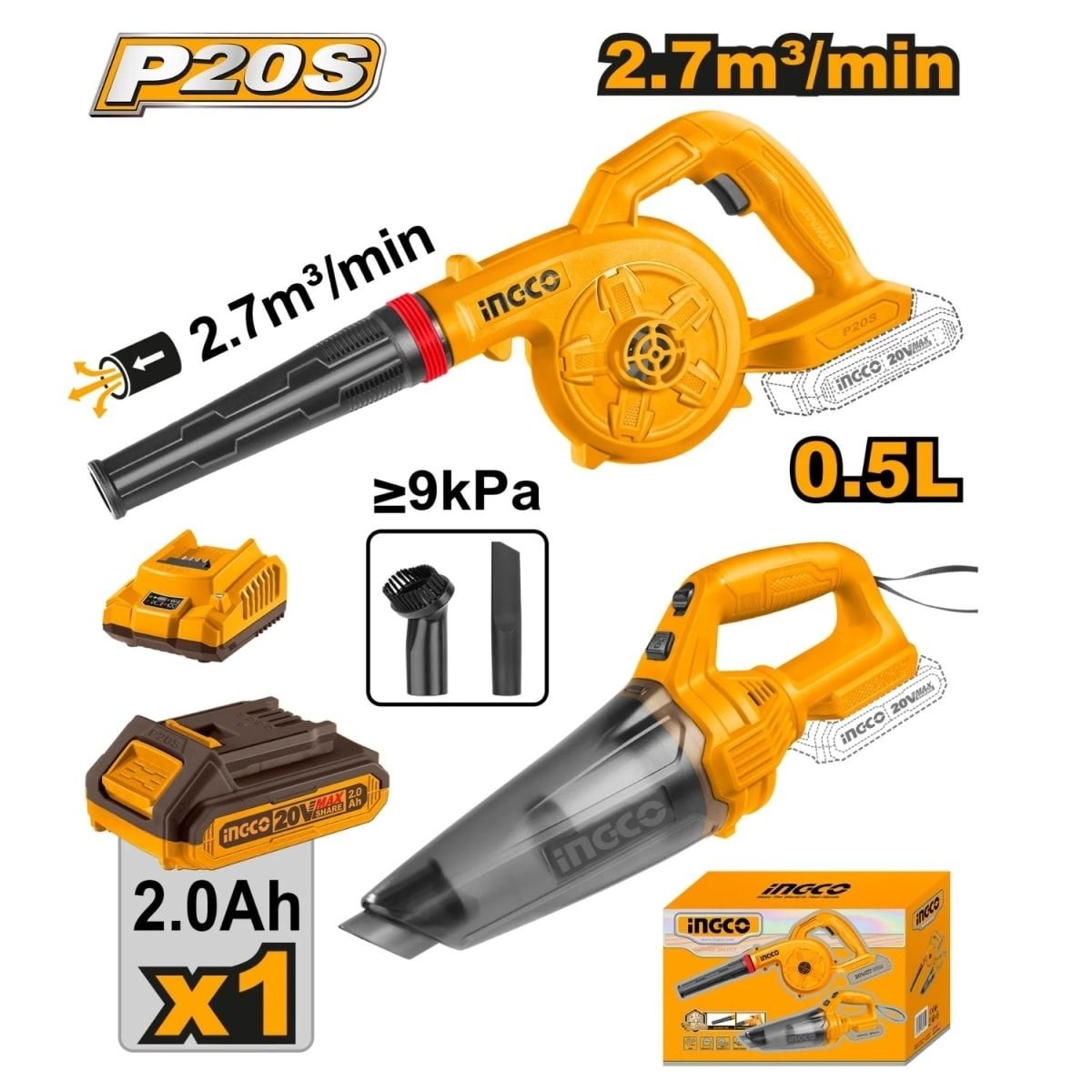 Kit inalámbrico INGCO 20V que combina sopladora y aspiradora en un solo combo práctico y versátil. Ideal para limpieza rápida de talleres, hogares y áreas exteriores, permitiendo soplar residuos o aspirar polvo con total movilidad y comodidad.
