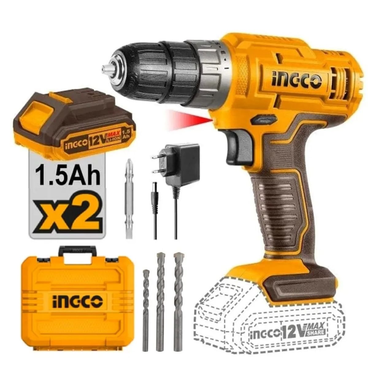 Taladro Atornillador Percutor Ingco CIDLI1228 12V + 2 Baterías + Kit