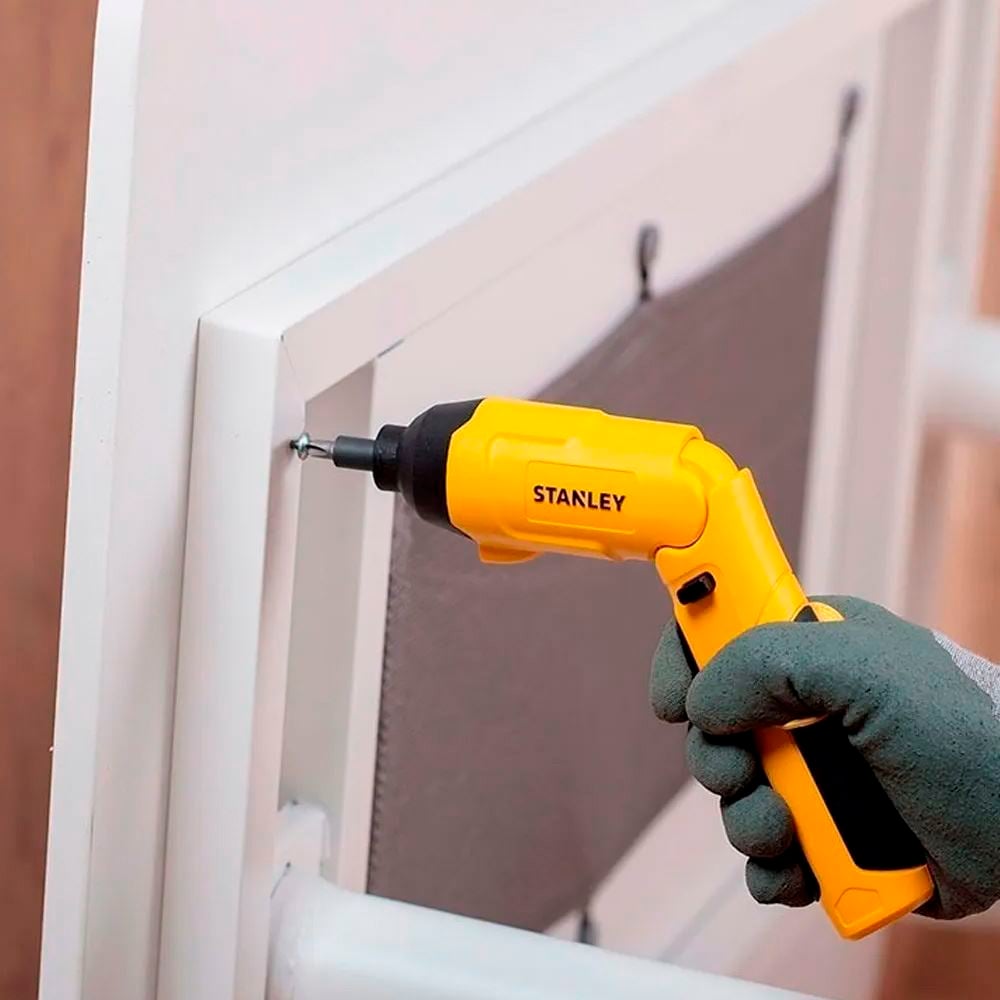 Taladro Atornillador Stanley 4v con motor de alto rendimiento y batería de 1.5 Ah recargable.