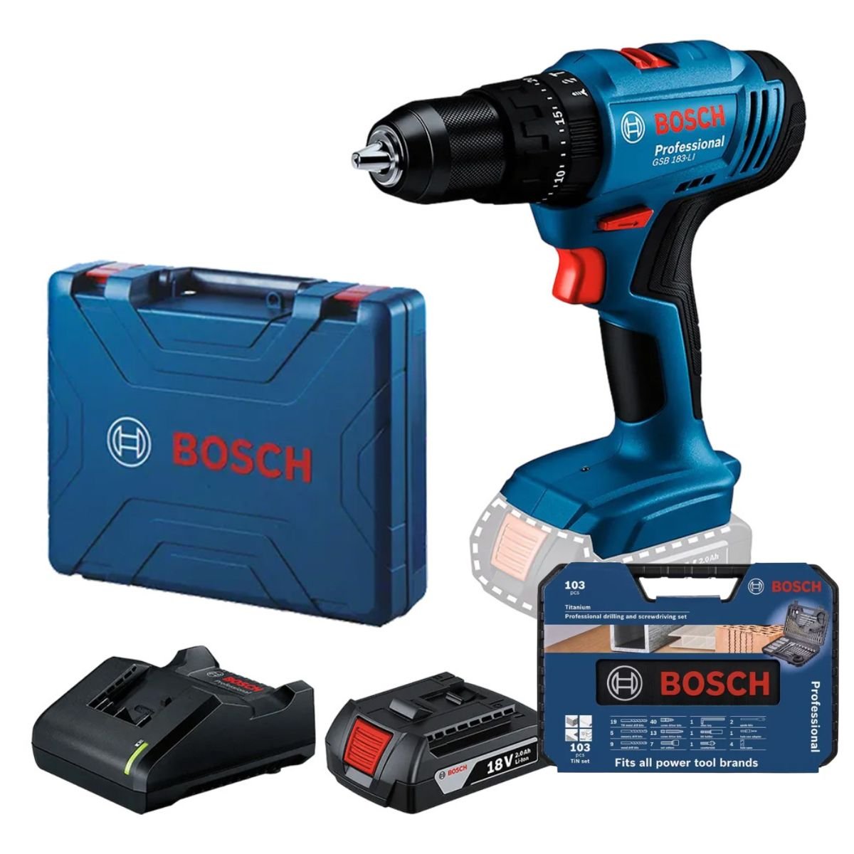 Taladro GSB 183-LI + Batería + Cargador + Set 103 pz Bosch