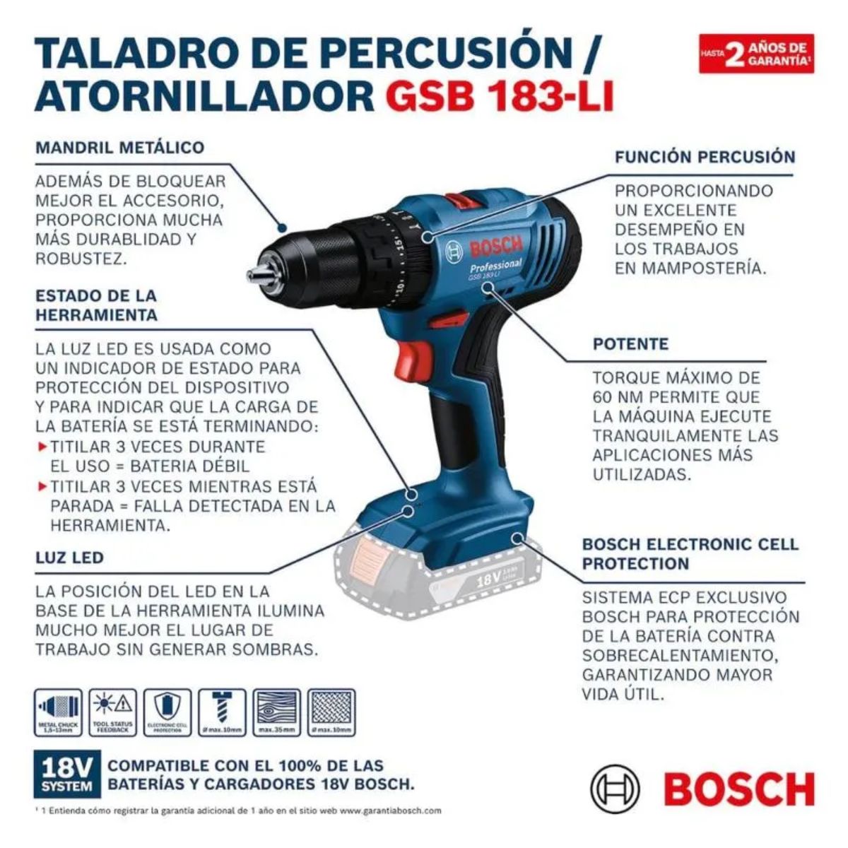 El GSB 183-LI de Bosch combina potencia y versatilidad con su motor de 18 V. Permite perforar madera, mampostería y metal con diámetros de hasta 35 mm, 10 mm y 10 mm, respectivamente. Su diseño evita sobrecalentamiento y prolonga la vida útil de la batería. Compatible con baterías y cargadores Bosch Professional de 18 V.