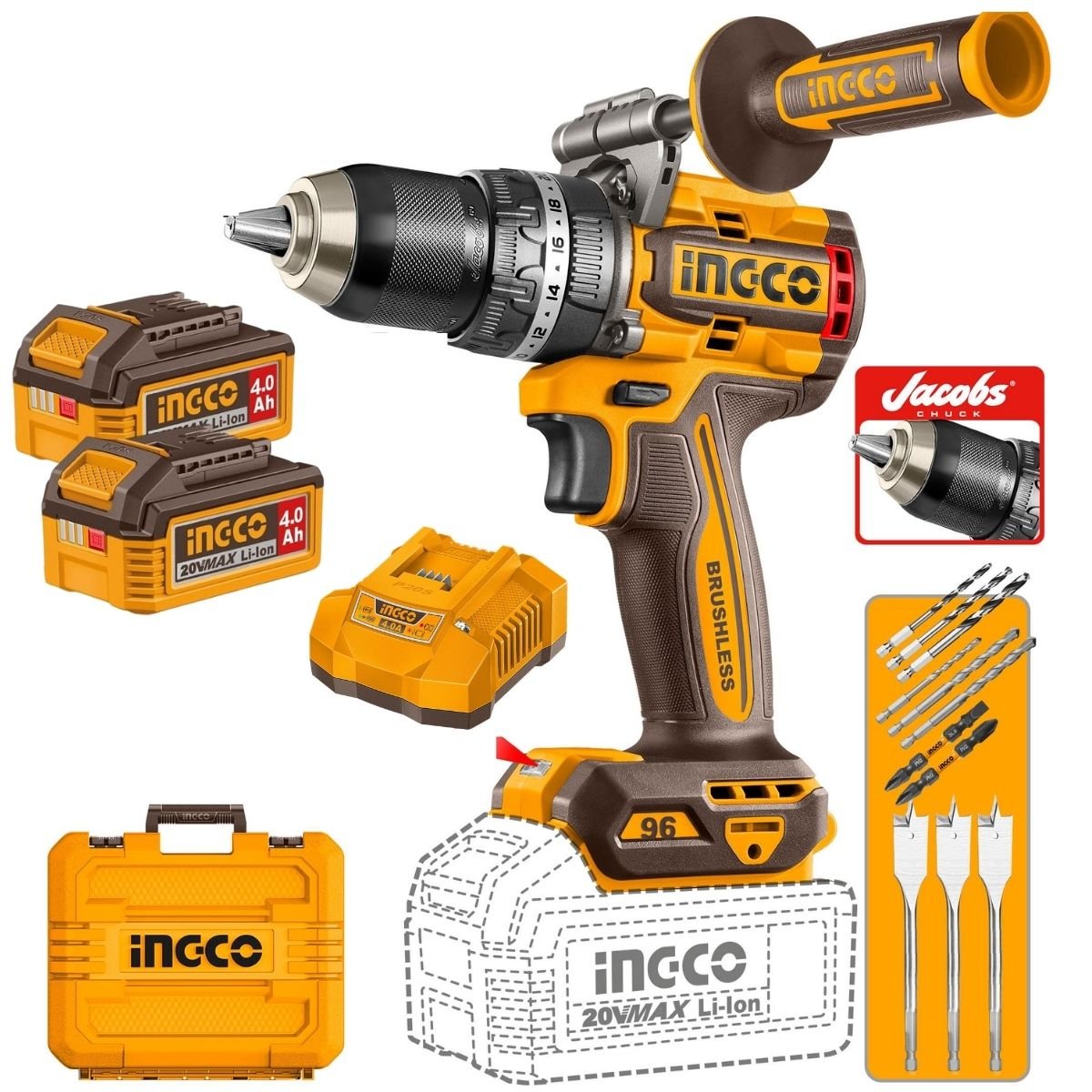 Taladro Atornillador Percutor INGCO 20V 96Nm Brushless + 2 Baterías 4Ah CIDLI209686