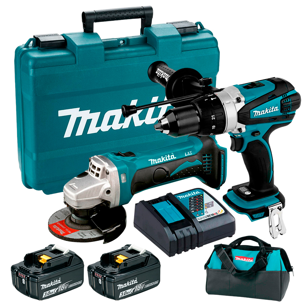 Taladro percutor DHP458RFE +Amoladora +2Baterías 3.0Ah +Lona