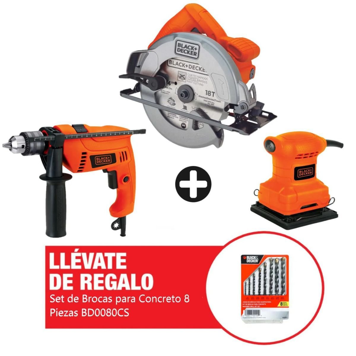Tricombo Black+Decker Taladro Percutor + Sierra Circular + Lijadora Orbital + Set de Brocas