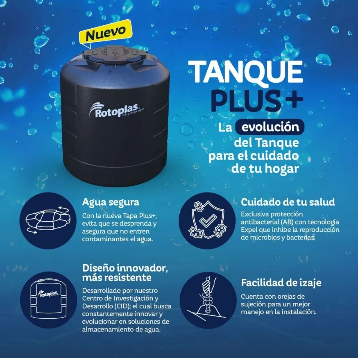 El Tanque Rotoplas Plus+ 2500L SMA es una solución robusta y segura para el almacenamiento de agua potable en viviendas, edificios y aplicaciones comerciales. Fabricado en polietileno de ultra alto peso molecular, ofrece alta resistencia estructural y larga vida útil. Incorpora la nueva Tapa Plus+ roscada de polipropileno negro, diseñada para evitar desprendimientos y proteger el agua contra contaminaciones externas. Gracias a la Tecnología Expel con protección antibacterial, reduce la proliferación de bacterias y microbios, garantizando agua más segura. Su diseño innovador desarrollado por el Centro de Investigación y Desarrollo (CID) de Rotoplas asegura facilidad de instalación, estabilidad y desempeño superior.