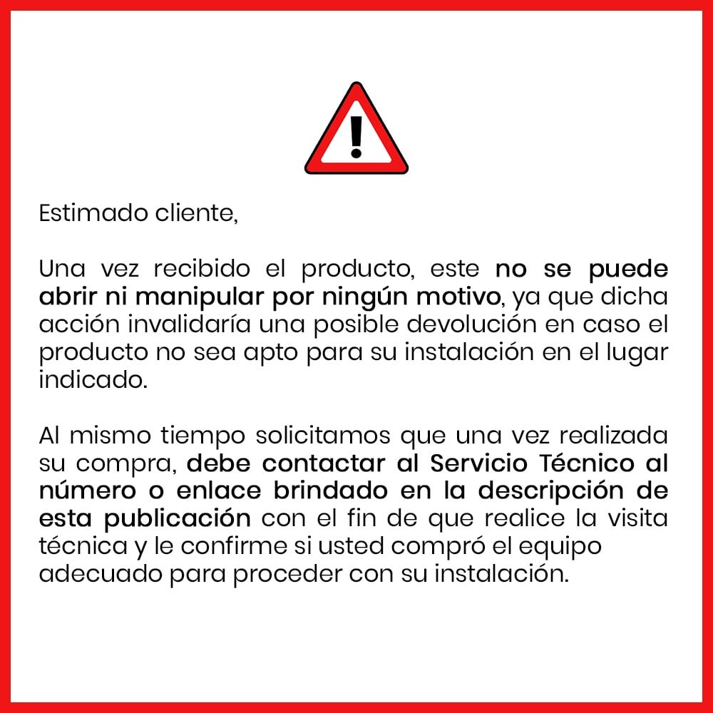 Al mismo tiempo solicitamos que una vez realizada su compra, debe contactar al Servicio Técnico al número o enlace brindado en la descripción de esta publicación con el fin de que realice la visita técnica y le confirme si usted compró el equipo adecuado para proceder con su instalación.