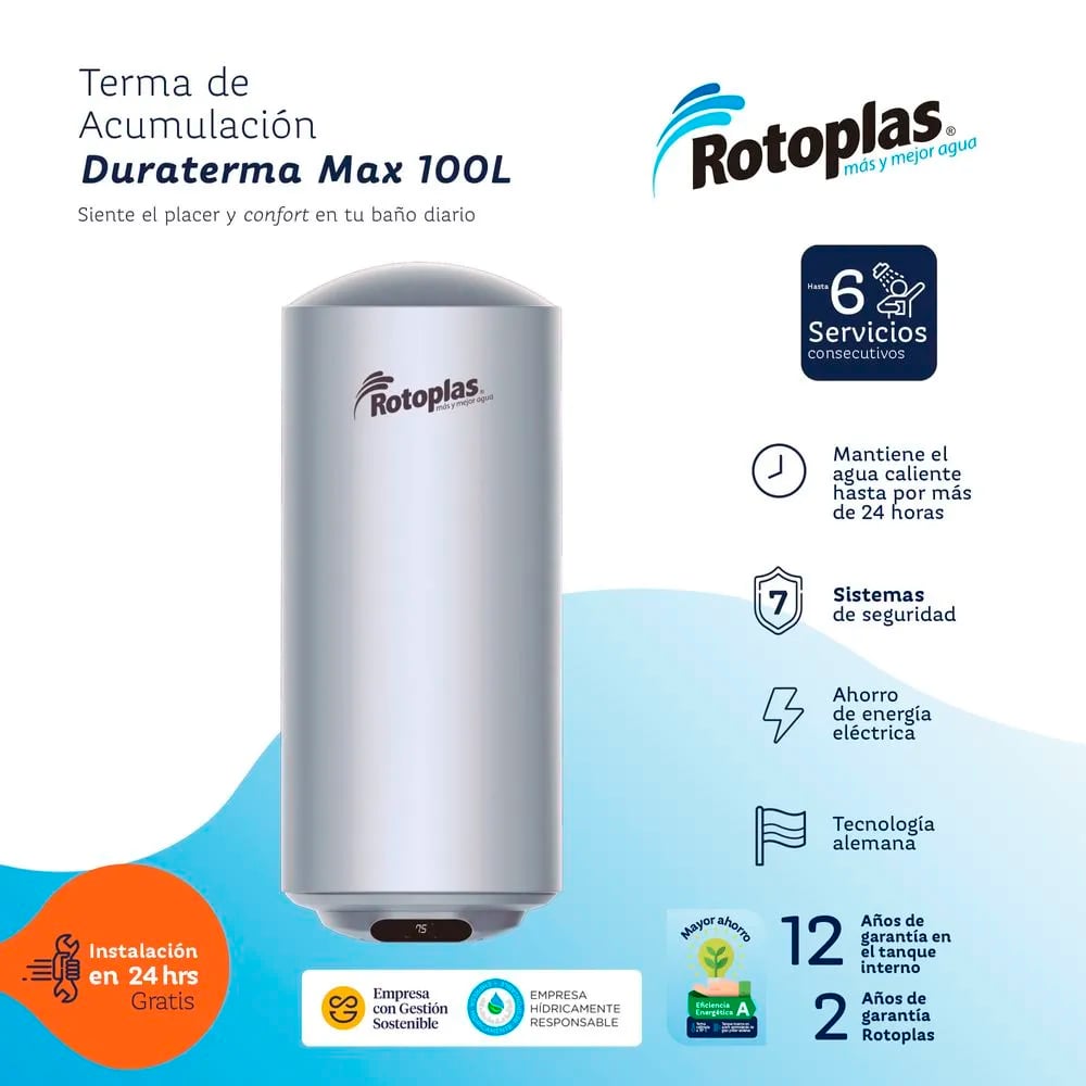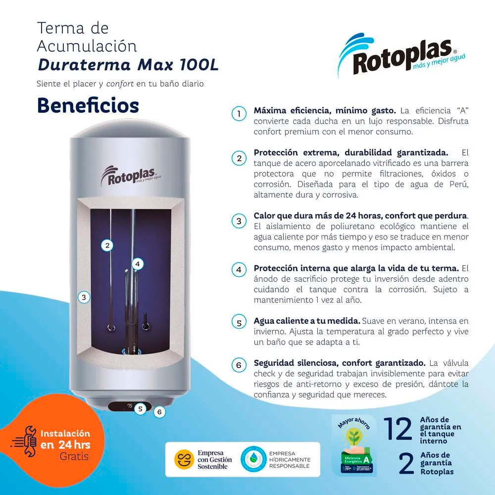 La Terma de Acumulación Duraterma Max 100L Rotoplas está diseñada para brindar agua caliente constante y de larga duración, ideal para familias que requieren mayor capacidad y confort en el hogar.