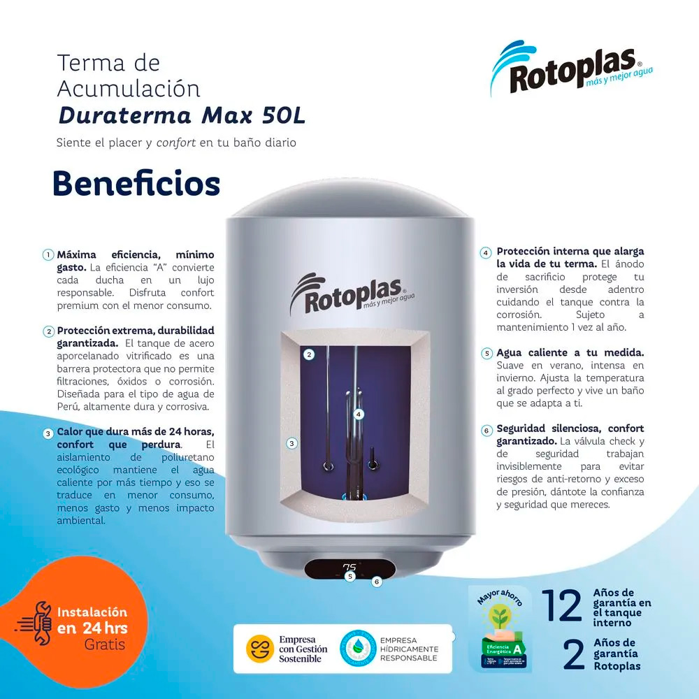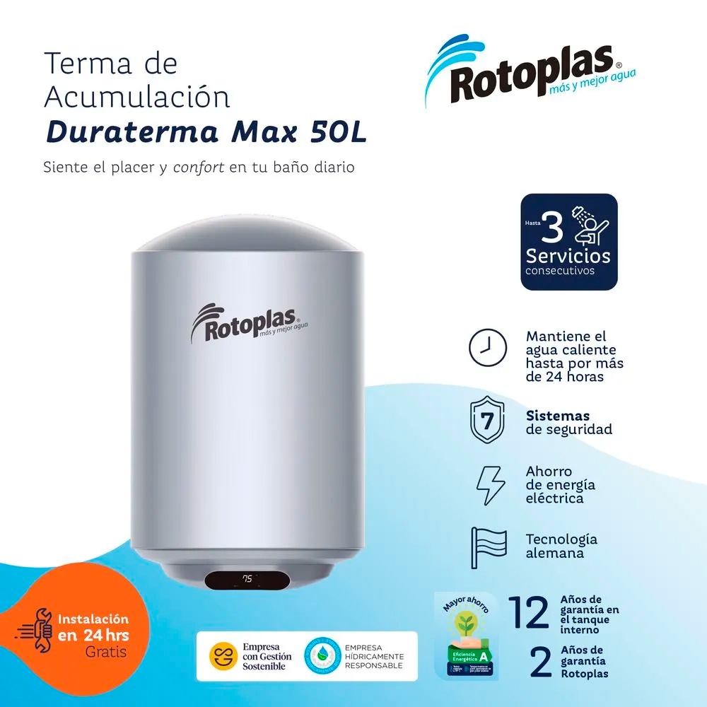 La Terma de Acumulación Duraterma Max 50L Rotoplas está diseñada para brindar agua caliente constante y de larga duración, ideal para familias que requieren mayor capacidad y confort en el hogar.