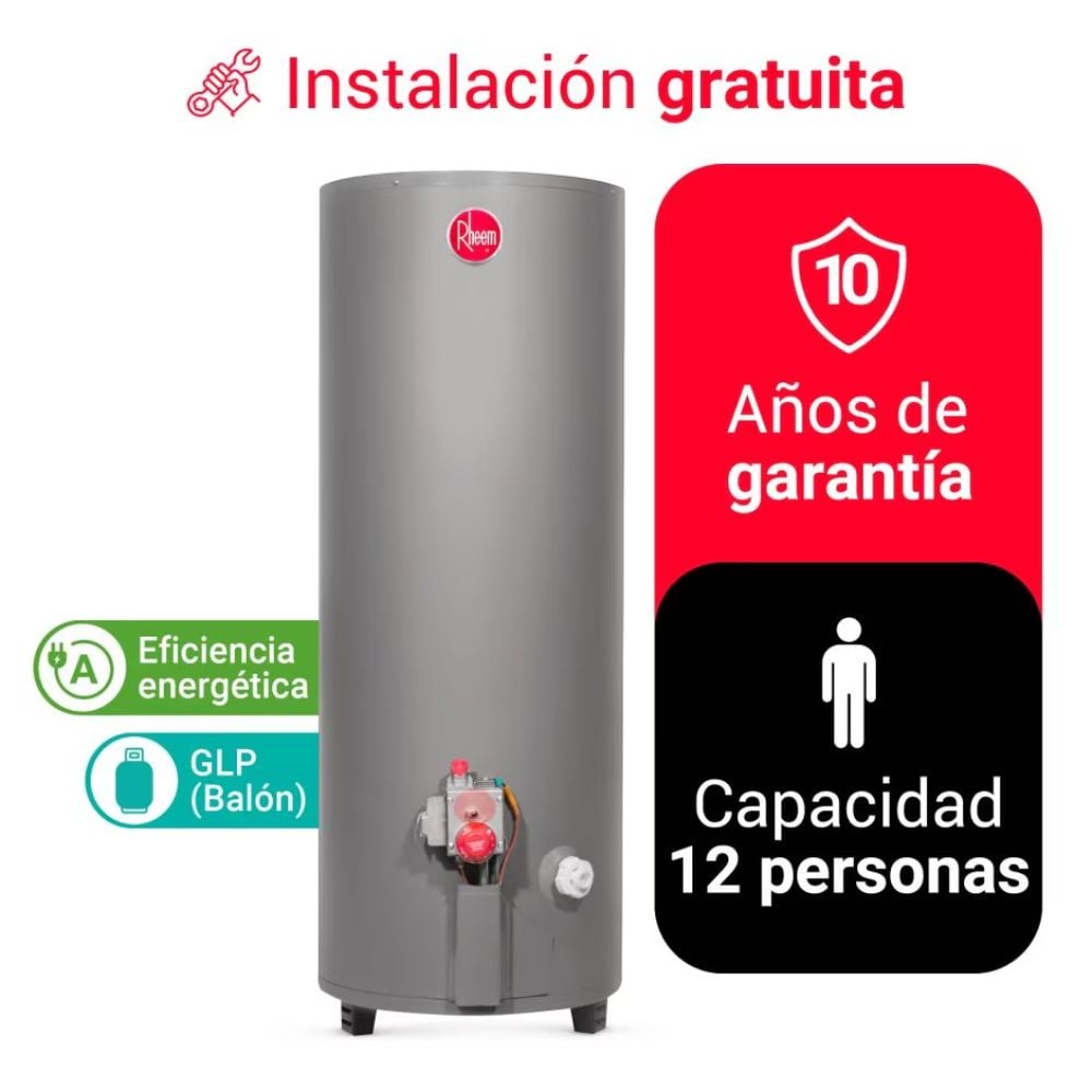 El Termotanque a Gas Rheem GLP 285L es la solución ideal para disfrutar de agua caliente sin interrupciones. Con una capacidad diseñada para abastecer varias duchas en simultáneo, garantiza un suministro constante y eficiente. Este producto es duradero y eficiente en el calentamiento de agua, gracias a su aislamiento de poliuretano, que garantiza una mayor eficiencia energética. Confía en la garantía y respaldo de una marca con más de 100 años de experiencia en el mercado, asegurando un producto de calidad y confiabilidad.