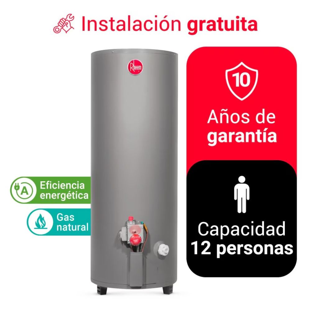 El Termotanque a Gas Rheem GN 285L es la solución ideal para disfrutar de agua caliente sin interrupciones. Con una capacidad diseñada para abastecer varias duchas en simultáneo, garantiza un suministro constante y eficiente. Producto para usar con redes de Gas Calidda y Promigas. Este termotanque es duradero y eficiente en el calentamiento de agua, gracias a su aislamiento de poliuretano, que garantiza una mayor eficiencia energética. Confía en la garantía y respaldo de una marca con más de 100 años de experiencia en el mercado, asegurando un producto de calidad y confiabilidad.