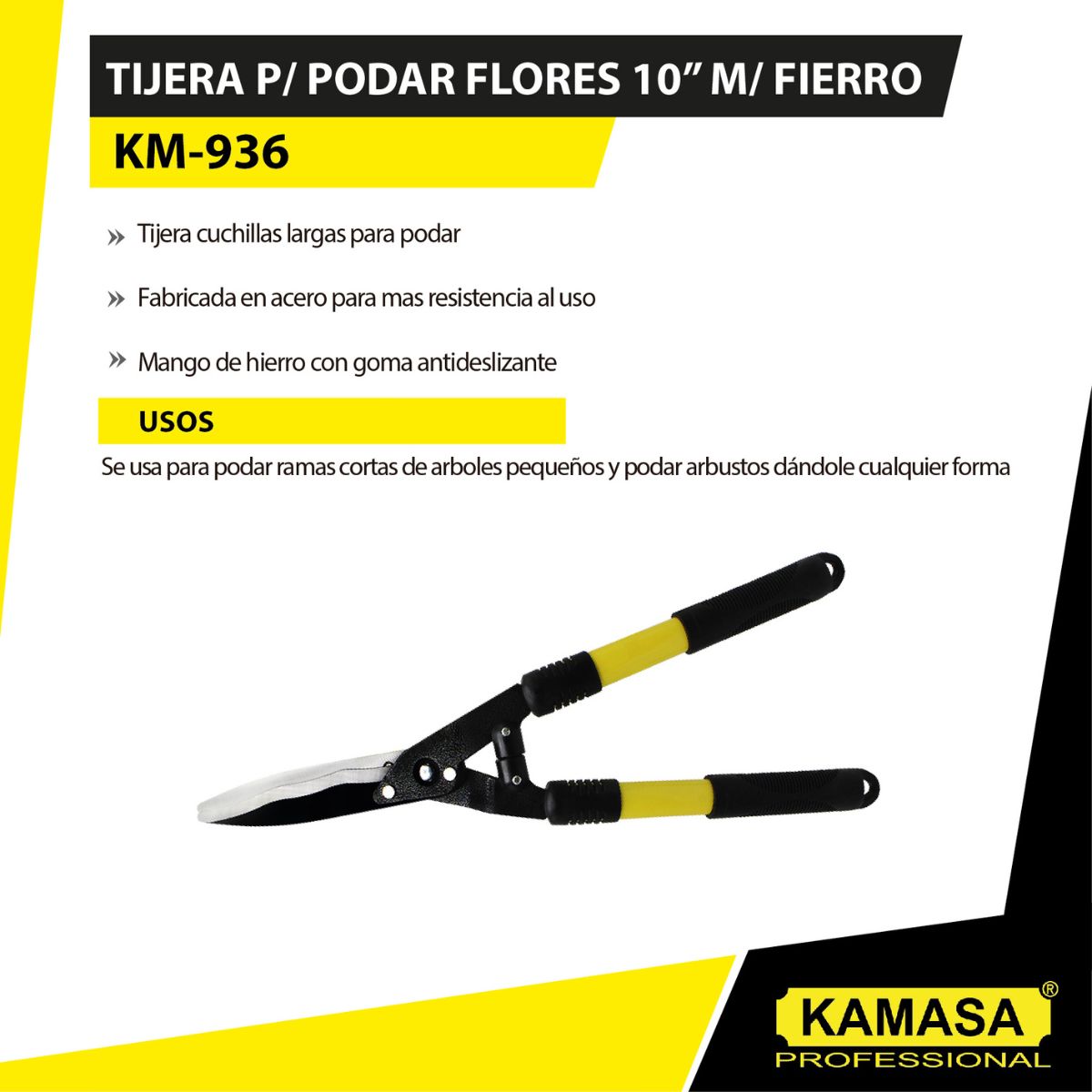 | | Tijera de podar 10″ con mango PVC | Uso con dos manos para mayor potencia | Ideal para poda de ramas y jardinería | Cuchilla de acero templado, corte limpio y preciso |