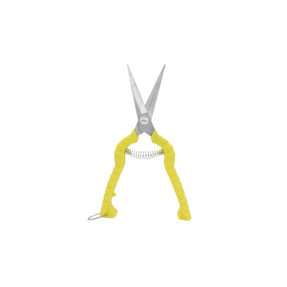 Tijera para podar uvas, mango verde corto pico puntiagudo de 8″, fabricada en acero resistente y resorte de abertura automatica y gancho de ajuste.