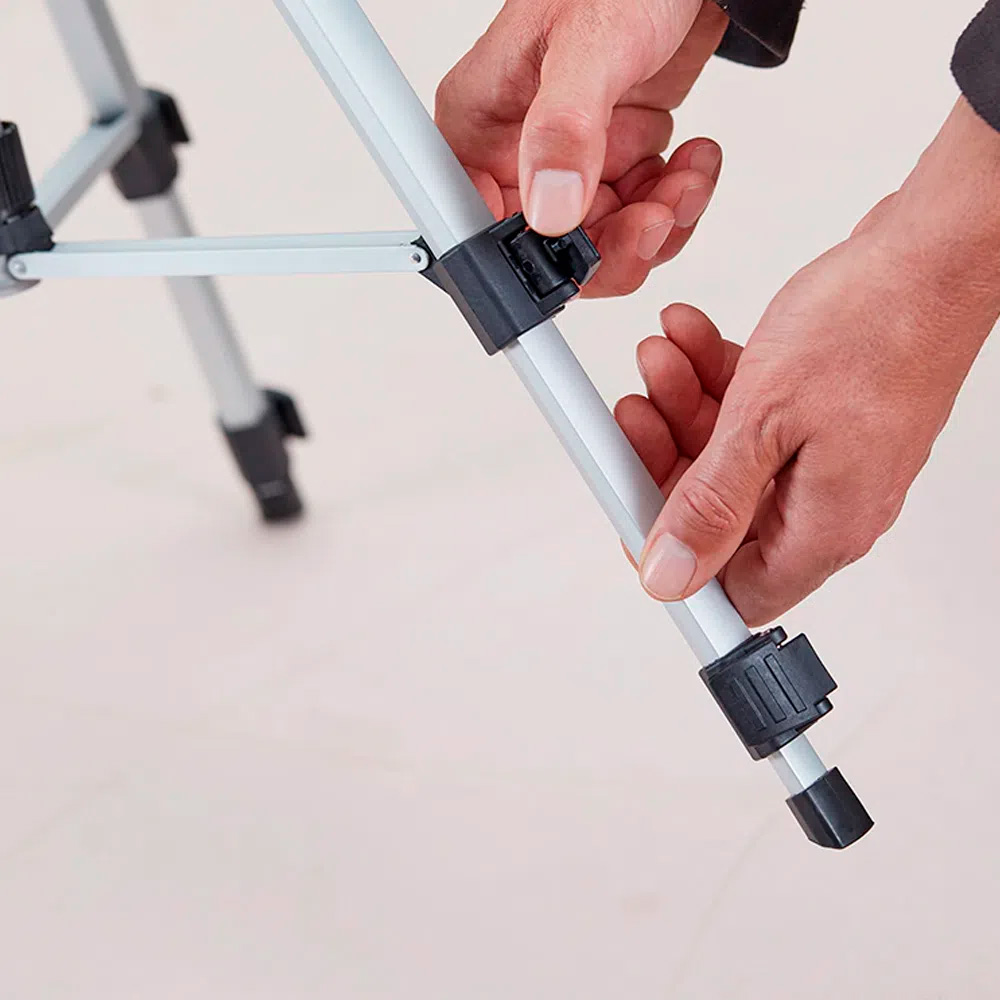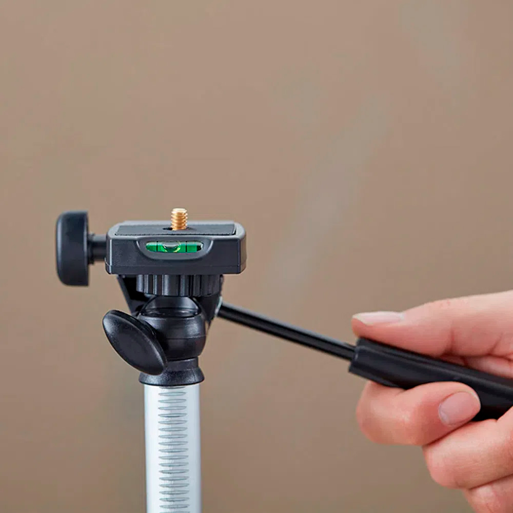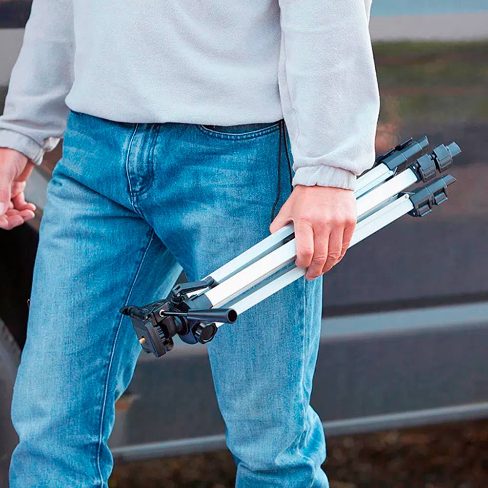 Su cuerpo es de aluminio extensible, con cremallera de columna central acompañada de una manivela niveladora que contribuye al ajuste del trípode.